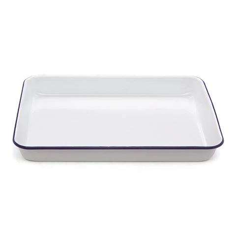 Enamel is distinct – especially if it’s Falcon enamelware. Since the 1920s, Falcon has filled British homes and kitchens with its pure white enamel bowls, tumblers and baking dishes, all with their tell-tale royal blue rim. It looks the part, and it’s incredibly tough, as each piece is made by fusing porcelain onto heavy-gauge steel. If you drop it, it won’t break. It’s resistant to chemicals. You can put it in the oven, and you can use it on gas and electric hobs.